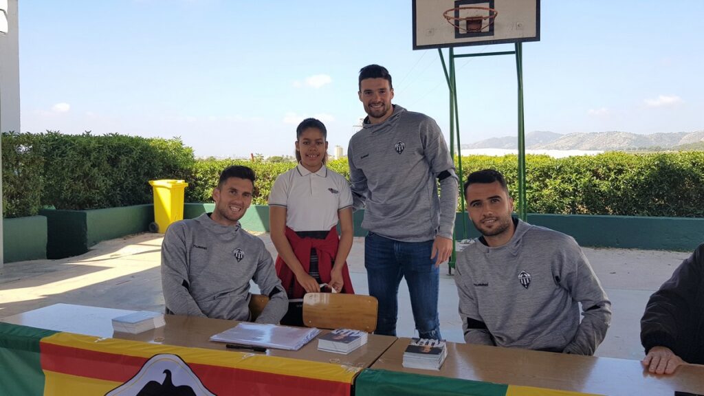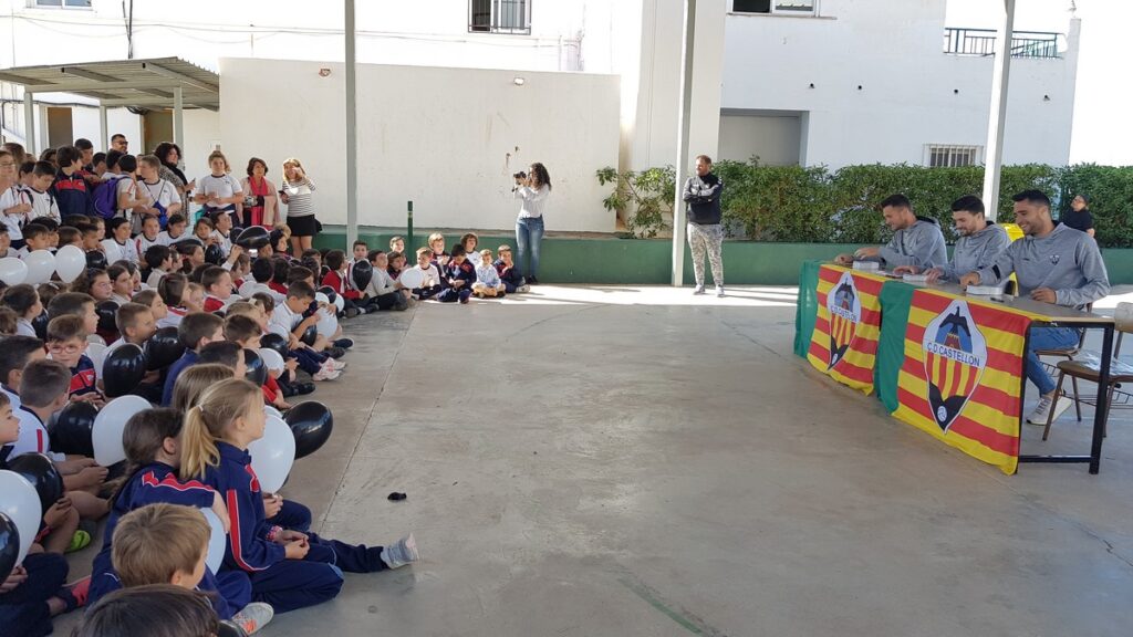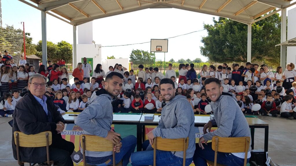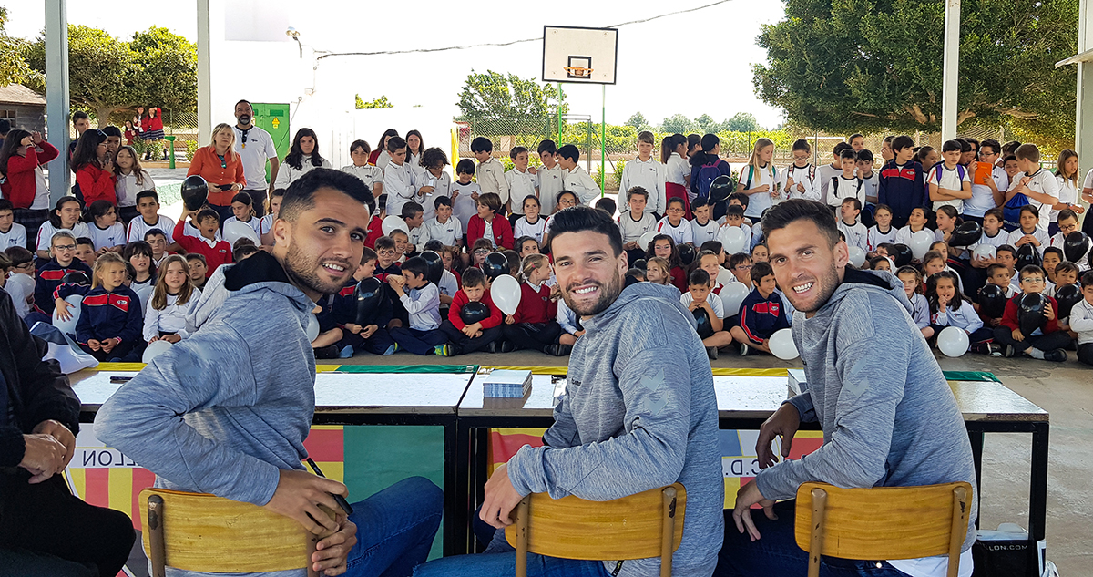 Los jugadores del CD Castellón, David Cubillas, Carlos Delgado y Eneko Satrústegui, se han desplazado esta mañana hasta el centro escolar con motivo de los premios ‘Pam Pam Orellut’.