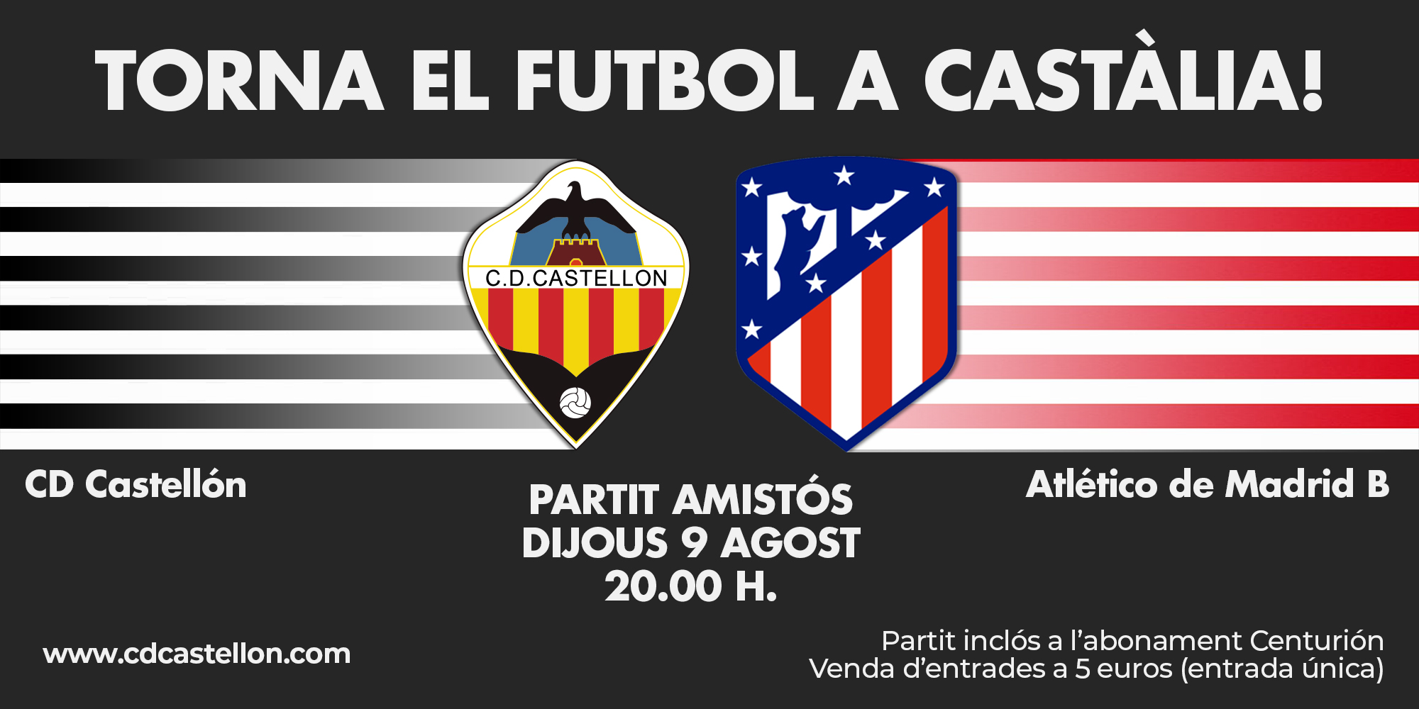 Tras la mágica noche que vivimos todos los albinegros el pasado 24 de junio, este jueves el fútbol vuelve a Castalia. El nuevo CD Castellón 2018-19 se medirá ante el filial del Atlético de Madrid, que milita en el Grupo I de Segunda B, el jueves 9 de agosto a partir de las 20.00 horas en el feudo situado en la avenida de Benicàssim.