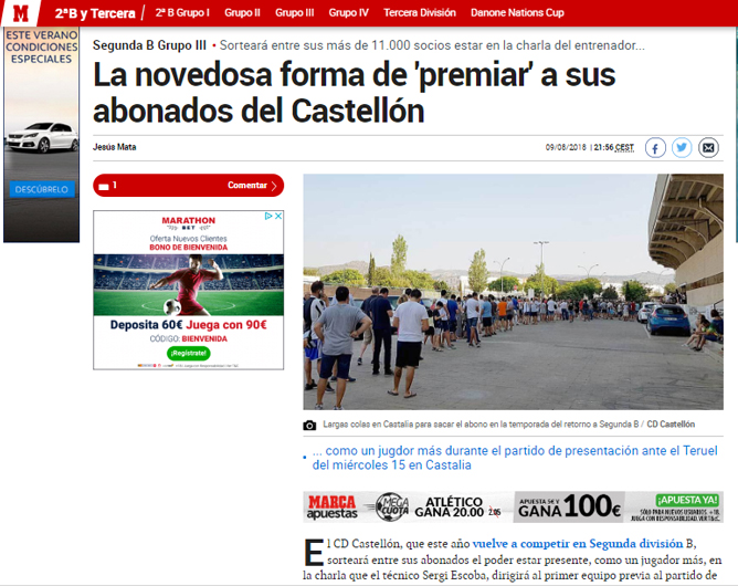 El diario AS destacaba en su titular que «Un abonado del Castellón podrá entrar en la charla de míster», destacando que el CD Castellón es, ahora mismo, el equipo con más abonados del los cuatro grupos de Segunda B. Por otro lado, MARCA, el periódico deportivo más leído de España, también destacó en su titular «la novedosa forma de premiar a sus abonados del Castellón» en la que también resalta la gran masa social que tiene el club.