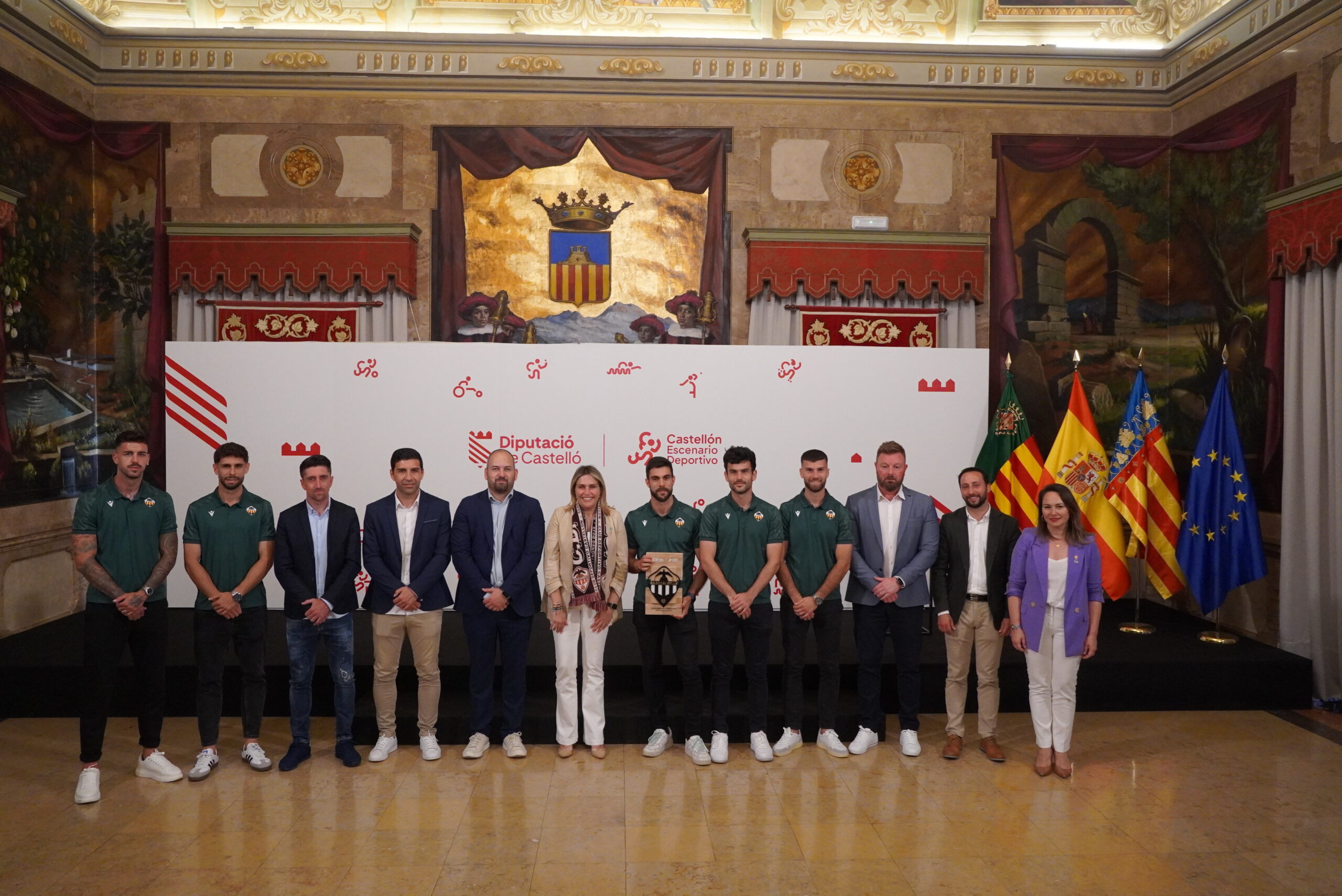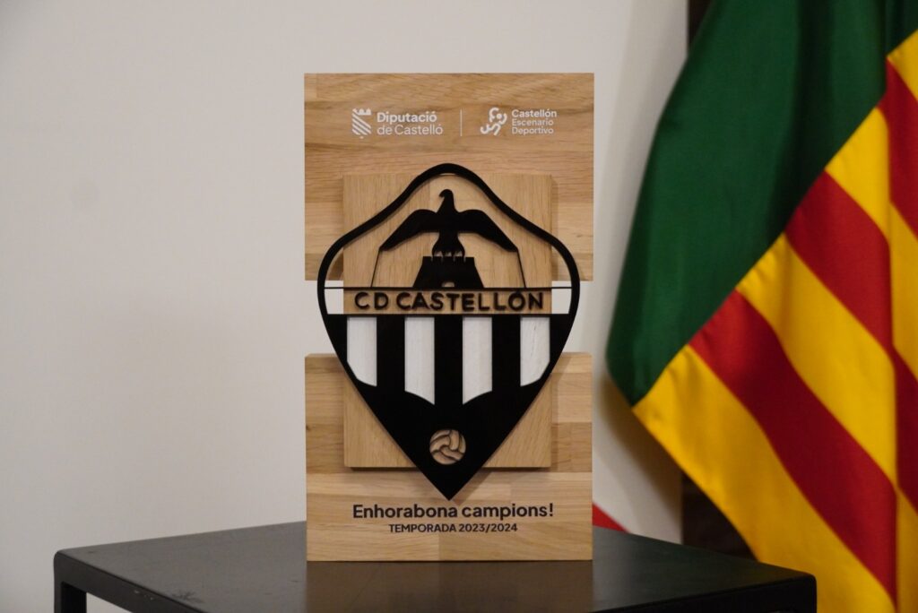 Marta Barrachina Mateu, presidenta de la Excelentísima Diputación de Castellón, e Iván Sánchez, Diputado de Deportes, encabezaron el acto en el que se han rendido honores al club y se le ha hecho entrega de una talla del escudo del CD Castellón con el mensaje: «Enhorabona campions!»