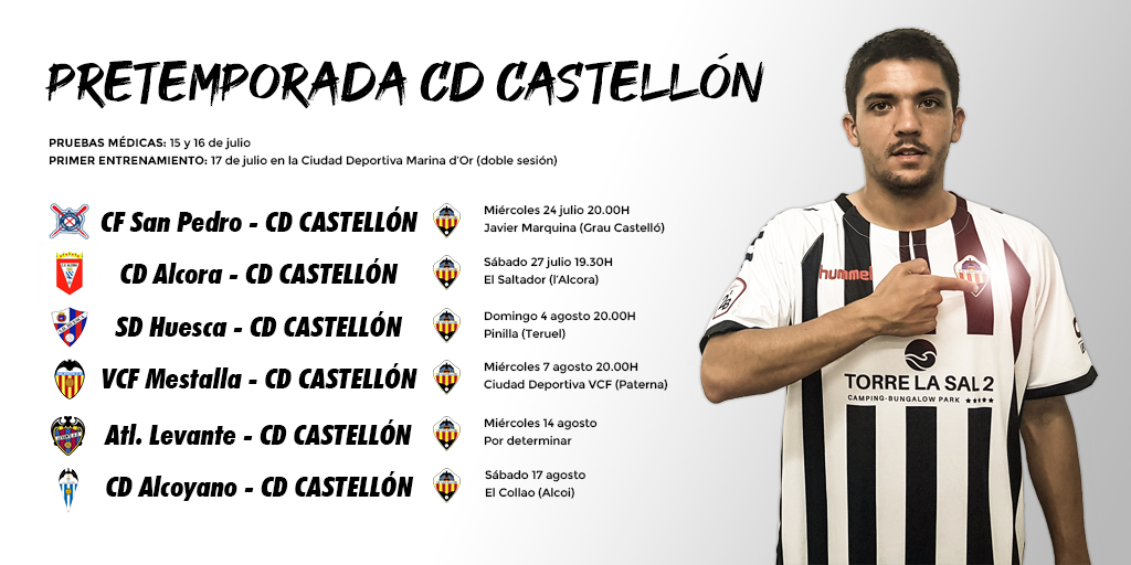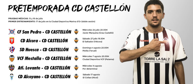 En lo que refiere a los partidos amistosos que disputará el CD Castellón durante los meses de julio y agosto, la Dirección Deportiva y el cuerpo técnico han planificado disputar hasta ocho partidos durante estas cinco semanas, de los que ya hay seis confirmados: San Pedro y Alcora serán los dos rivales provinciales para hacer las primeras probaturas el 24 y 27 de julio, respectivamente, mientras que poco a poco el CD Castellón irá subiendo el nivel y se enfrentará al Huesca, recién descendido de Primera División, el 4 de agosto en el campo de Pinilla (Teruel). A continuación, los ‘orelluts’ se medirán a dos rivales del Grupo III de Segunda B que además son los dos filiales de los principales equipos autonómicos: Valencia Mestalla y Atlético Levante, el 7 y 14 de agosto, respectivamente. Por último, el CD Castellón tiene previsto poner el broche final a la pretemporada el 17 de agosto en El Collao ante el Alcoyano, recién descendido a Tercera División.