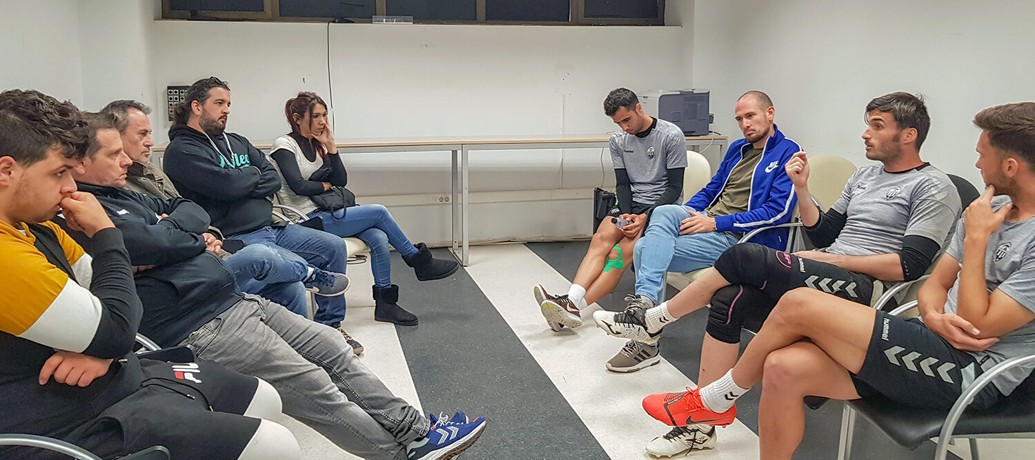 Los capitanes del CD Castellón, David Cubillas, Marc Castells, Álvaro Campos y Carlos Delgado, se han reunido esta tarde en la Sala de Prensa del Estadio Municipal de Castalia con representantes de la Agrupació de Penyes Albinegres (ADPA) y de la Federación de Peñas del CD Castellón (FEDPECAS).