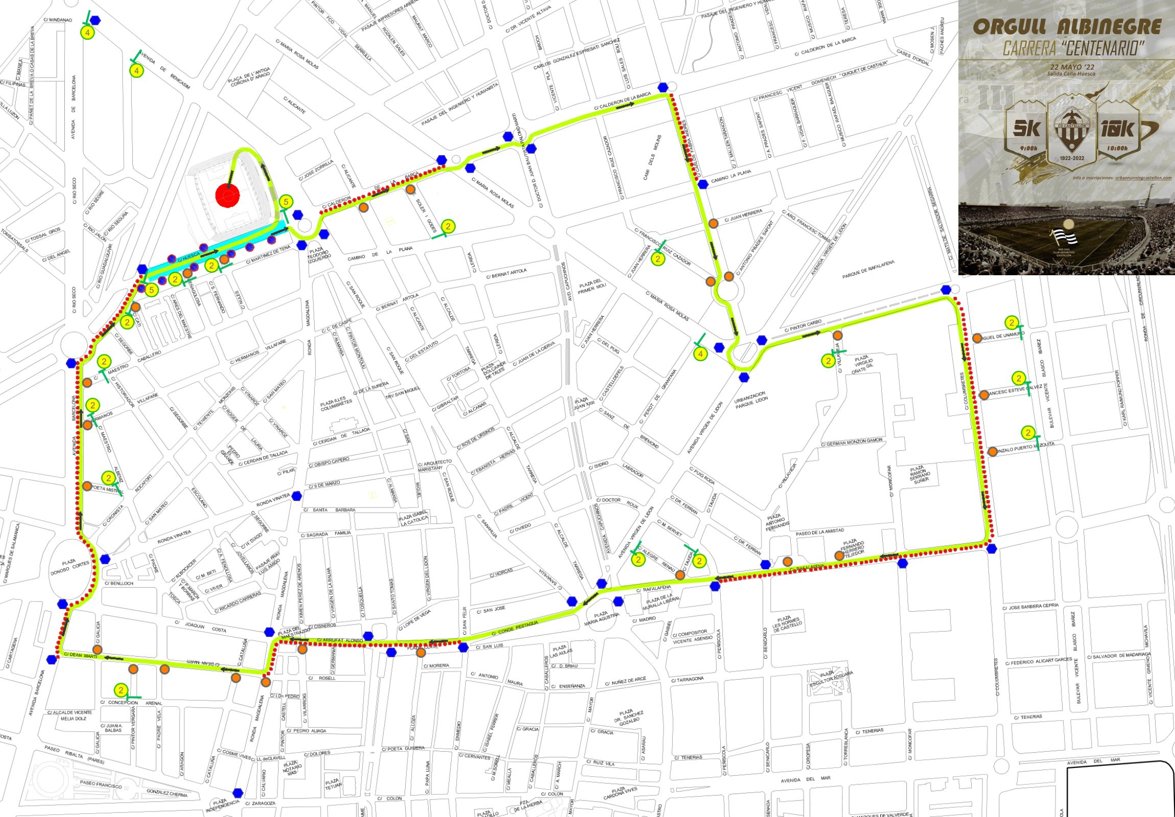 A falta de casi tres semanas para que Orgull Albinegre vuelva a estar presente en las calles de Castellón, ya se ha dado a conocer el circuito de esta edición. Este año se ha optado por repetir el mismo que la edición pasada, que tuvo un recorrido lineal y que transcurrió por avenidas más anchas para que los corredores se sintieran más cómodos a la hora de mostrar su ‘orgull albinegre’ en el año del Centenario. La Rotonda de la Afición, Donoso Cortés, Jaume I, María Agustina o el Tombatossals serán algunos de los puntos más representativos por donde se espera que más de mil participantes vuelvan a enfundarse la particular albinegra y finalicen en el césped del Estadio Municipal de Castalia.