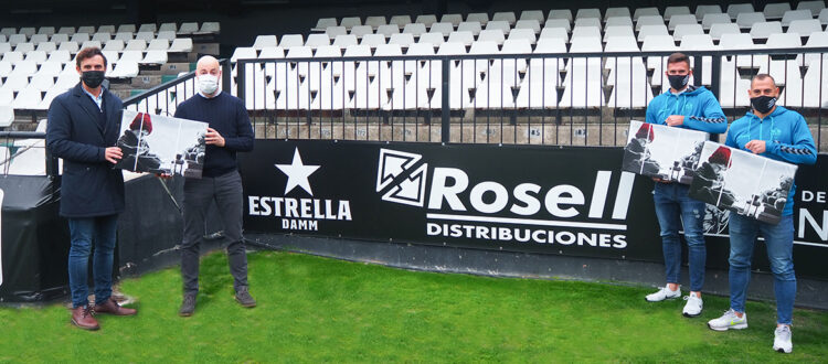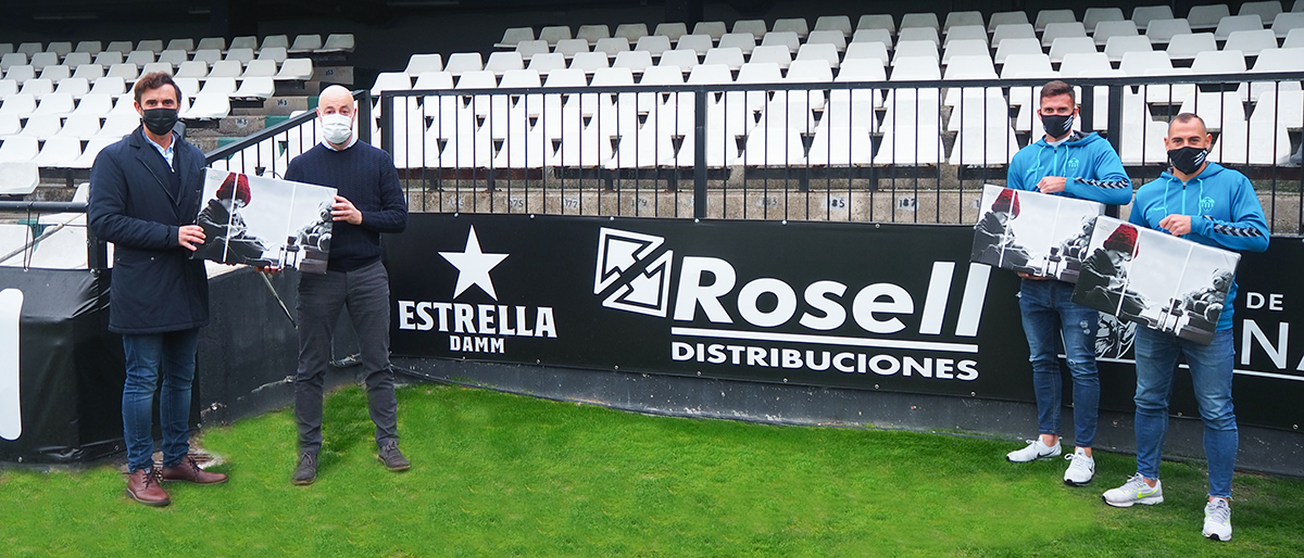 Nacho Rosell, gerente de Distribuciones Rosell, ha visitado esta mañana el Estadio Municipal de Castalia para entregar en persona una de estas cajas al director de Negocio, Pepe Mascarell, y a dos jugadores del primer equipo, César Díaz y Carlos Delgado.