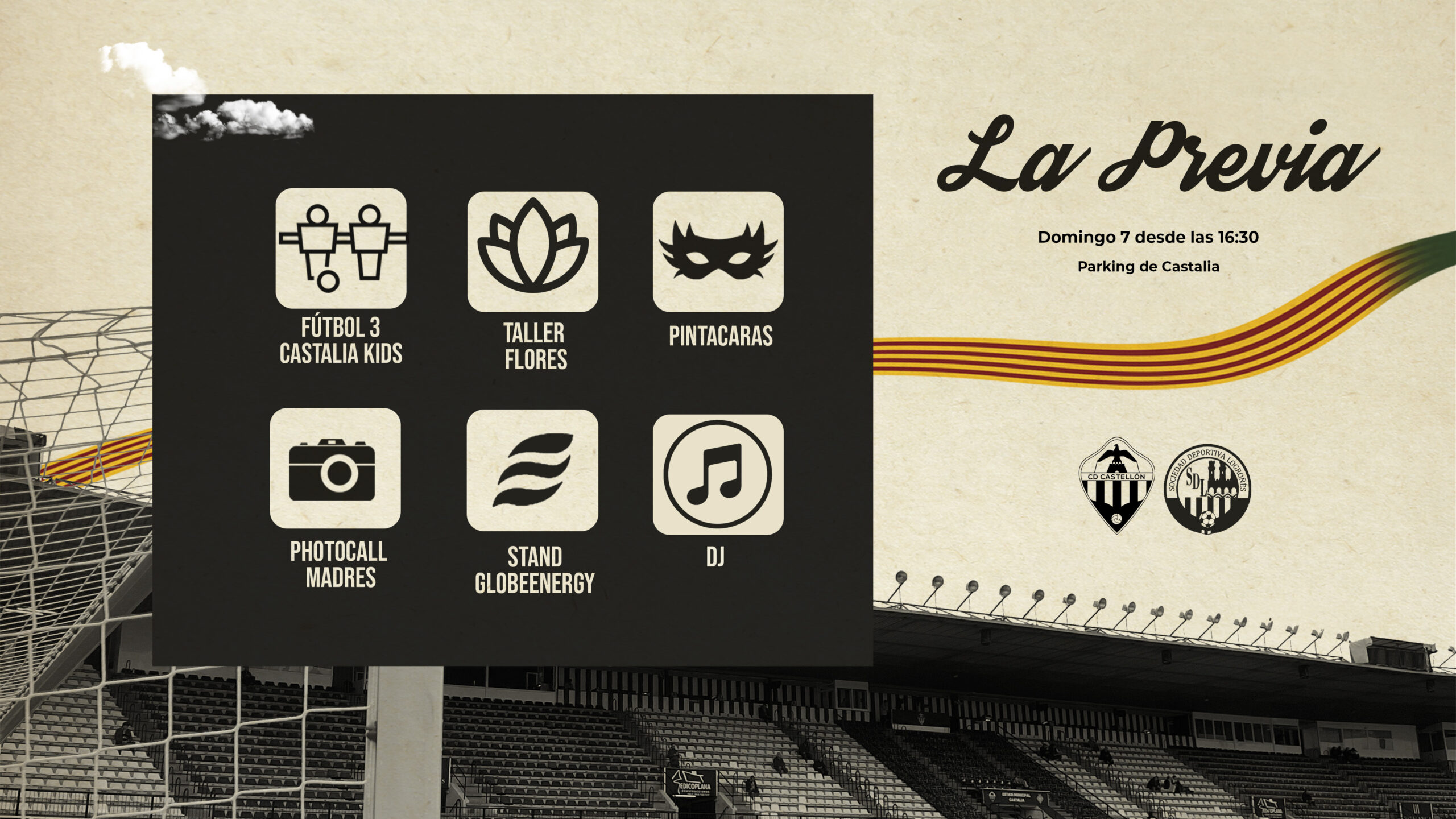 – Stand Globeenergy: uno de los mayores patrocinadores de esta temporada del CD Castellón dispondrá de un punto de información en la previa del encuentro ante la SD Logroñés para abastecer de datos y resolver las dudas de los aficionados del conjunto albinegro sobre el servicio de la empresa.