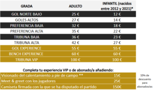 Los abonados también pueden adquirir cualquiera de las tres experiencias VIP (sin necesidad de comprar la entrada en Tribuna VIP, Bench Experience o Gol Experience) a través del área del abonado con un 10% de descuento sobre el precio de venta al público general: