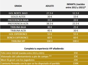 - Domingo (día del partido): las taquillas estarán abiertas desde las 15 horas hasta el inicio del encuentro (18:30h)