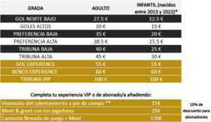 Los abonados también pueden adquirir cualquiera de las tres experiencias VIP (sin necesidad de comprar la entrada en Tribuna VIP, Bench Experience o Gol Experience) a través del área del abonado con un 10% de descuento sobre el precio de venta al público general.