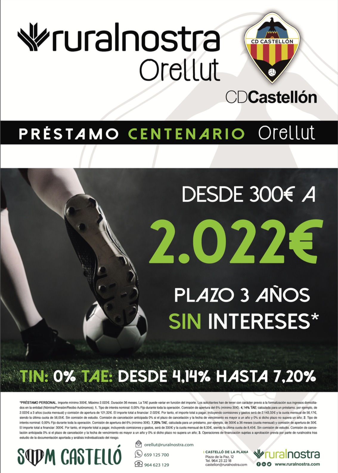 La financiación de las acciones podrá realizarse en Ruralnostra hasta en 36 meses con un 0% de interés TIN a través del préstamo ‘Centenario Orellut’, un préstamo que permite al accionista obtener hasta 2.022 euros, en honor al próximo centenario de la entidad. Además, la afición también puede aprovecharse de las tarjetas de débito y de crédito ‘orellut’, personalizadas con los colores del Club y el escudo del CD Castellón.